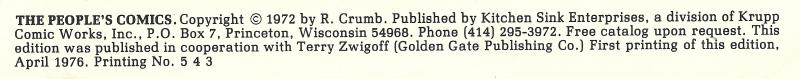 2nd print April 1976 has 0.75 USD cover price. Says printing 54321. First Kitchen Sink printing.