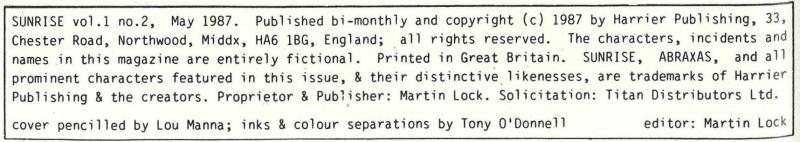 Sunrise, Abraxas, and all prominent characters featured in this issue, & their distinctive likenesses, are trademarks of Harrier Publishing & the creators.