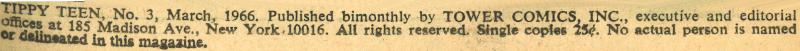 Indicia: TIPPY TEEN, No.3, March, 1966. Published bimonthly by TOWER COMICS, INC., executive and editorial offices at 185 Madison Ave., New York 10016. All rights reserved. Single copies 25ยข. No actual person is named or delineated in this magazine.