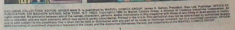 Indicia: EXCLUSIVE COLLECTORS' EDITON [sic]: SPIDER-MAN ® is published by MARVEL COMICS GROUP, James E. Galton, President. Stan Lee, Publisher. OFFICE OF PUBLICATION: 575 MADISON AVENUE, New York, N.Y. 10022. Copyright © 1980 by Marvel Comics Group, a division of Cadence Industries Corporation. All rights reserved. No similarity between any of the names, characters, person and/or institutions in this magazine with those of any living or dead person or institution is intended, and any such similarity which may exist is purely coincidental. Printed in the U.S.A. This periodical may not be sold except by authorized dealers and is sold subject to the conditions that it shall not be sold or distributed with any part of its cover or markings removed, nor in a mutilated condition. SPIDER-MAN (including all prominent characters featured in the issue) and the distinctive likenesses thereof are trademarks of the MARVEL COMICS GROUP.