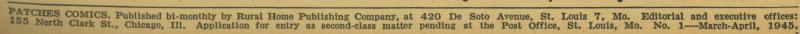 Disclose Notes: Published at 420 Desoto Ave, St Louis Mo (World Color). Editorial offices: 155 N Clark St Chicago Ill. Indicia says "Patches Comics." Distributed by PDC.