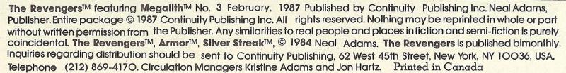 Disclose Notes: Indicia reads "Revengers featuring Megalith". This is regarded as a misprint (See issue http://www.comics.org/issue/41998/)