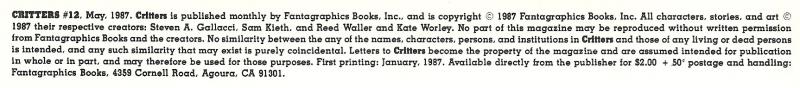 Critters is copyright © 1987 Fantagraphics Books, Inc. All characters, stories, and art © 1987 their respective creators: Steven A. Gallacci, Sam Keith, and Reed Waller and Kate Worley.