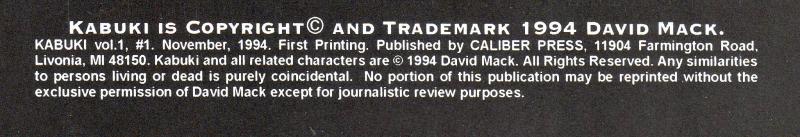 First appearance of Kabuki's published stories. Kabuki's first appearance as a character was in a promotional house advertisement in Urban Decay: Fork / Urban Decay: Zero Joe (Anubis Press, 1994 series) #0 (November 1994) for Anubis Press Kabuki series that was never published. Likely, the material for that unpublished issue ended up in this one-shot.