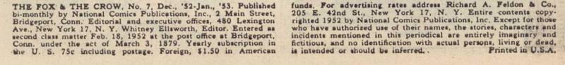 Indicia: THE FOX & THE CROW, No. 7, Dec., '52-Jan., '53. Published bi-monthly by National Comics Publications, Inc., 2 Main Street, Bridgeport, Conn. Editorial and executive offices, 480 lexington Ave., New York 17, N. Y. Whitney Ellsworth, Editor. Entered as second class matter Feb. 18, 1952, at the post office at Bridgeport, Conn. under the act of March 3, 1879. Yearly subscription in the U. S. 75ยข including postage. Foreign, $1.50 in American funds. For advertising rates address Richard A. Feldon & Co., 205 E. 42nd St., New York 17, N. Y. Entire contents copyrighted 1952 by National Comics Publications, Inc. Except for those who have authorized use of their names, the stories, characters and incidents mentioned in this periodical are entirely imaginary and fictitious, and no identification with actual persons, living or dead, is intended or should be inferred. Printed in U.S.A.
