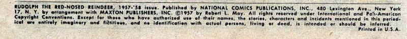 Disclose Notes: Indicia: "RUDOLPH THE RED-NOSED REINDEER 1957-'58 ISSUE. Published by NATIONAL COMICS PUBLICATIONS, INC., 480 Lexington Ave., New York 17, N. Y., by arrangement with MAXTON PUBLISHERS, INC. ©1957 by Robert L. May. All rights reserved under International and Pan-American Copyright Conventions. Except for those who have authorized use of their names, the stories, characters and incidents mentioned in this periodical are entirely imaginary and fictitious, and no identification with actual persons, living or dead, is intended or should be inferred. Printed in U.S.A."