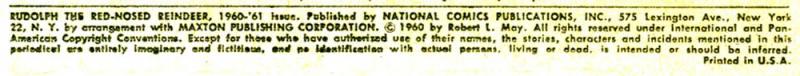 Disclose Notes: Indicia: "RUDOLPH THE RED-NOSED REINDEER 1960-'61 Issue. Published by NATIONAL COMICS PUBLICATIONS, INC., 575 Lexington Ave., New York 22, N. Y., by arrangement with MAXTON PUBLISHERS, INC. © 1960 by Robert L. May. All rights reserved under International and Pan-American Copyright Conventions. Except for those who have authorized use of their names, the stories, characters and incidents mentioned in this periodical are entirely imaginary and fictitious, and no identification with actual persons, living or dead, is intended or should be inferred. Printed in U.S.A."