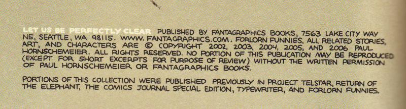 Disclose Notes: Portions of this collection were published previously in the Chicago Reader, Chunklet Magazine, Forlorn Funnies, Project Telstar, Return of the Elephant, The Comics Journal Special Edition, and Typewriter.