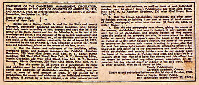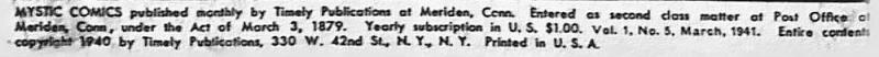 MYSTIC COMICS published monthly by Timely Publications at Meriden, Conn. Entered as second class matter at Post Office at Meriden, Conn, under the Act of March 3, 1879. Yearly subscription in U. S. $1.00. Vol. 1, No. 5, March, 1941. Entire contents copyright 1940 by Timely Publications, 330 W. 42nd St., N. Y., N. Y. Printed in U. S. A.