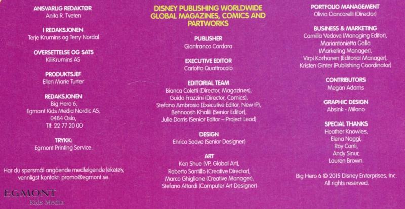 Disclose Notes: bc 1758 005. Returuke 1525. Trykk: Egmont Printing Service. Utgitt innplastet med Big Hero 6 skrivesaker, batch #1401609.
