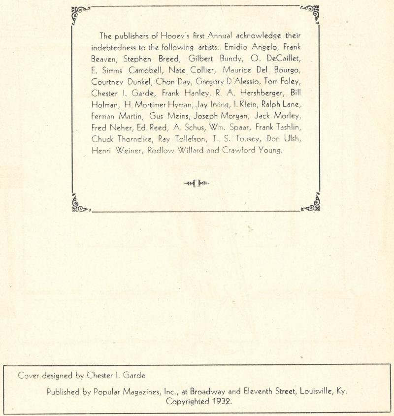 The publishers of Hooey's first Annual acknowledge their indebtedness to the following artists: Emidio Angelo, Frank Beaven, Steven Breed, Gilbert Bundy, O. DeCaillet, E. Simms Campbell, Nate Collier, Maurice Del Bourgo, Courtney Dunkel, Chon Day, Gregory D'Alessio, Tom Foley, Chester I. Garde, Frank Hanley, R. A. Hershberger, Bill Holman, H. Mortimer Hyman, Jay Irving, I. Klein, Ralph Lane, Ferman Martin, Gus Meins, Joseph Morgan, Jack Moreley, Fred Neher, Ed Reed, A. Schus, Wm. Spaar, Frank Tashlin, Chuck Thorndike, Ray Tollefson, T. S. Tousey, Don Ulsh, Henri Weiner, Rodlow Willard, and Crawford Young.