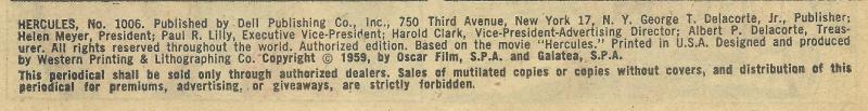 Indicia title is "HERCULES, No. 1006." Code number is HERCULES.O.S. #1006-597. Copyright 1959 by Oscar Film, S.P.A, and Galatea, S.P.A.