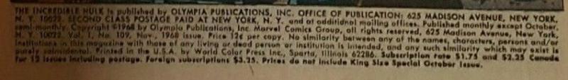 On Sale Date from the publication date reported to the Catalog of Copyright Entries, Third Series, Volume 22, Part 2, Periodicals, January-December 1968. Copyright number B474888. Copyright given to Olympia Publications, Inc., Marvel Comics Group.