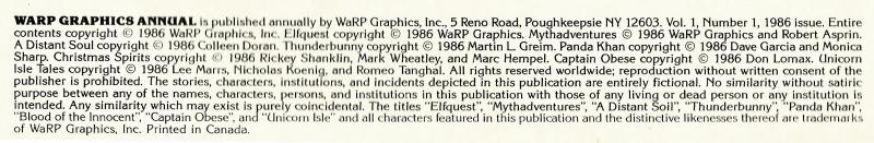 A house ad in Thunderbunny (1985 series) #4 states that Warp Graphics Annual #1 is "on sale now". Thunderbunny #4 has a registered publication date of January 8th 1986.