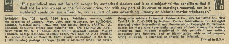 Reprint of Batman #123 (DC, 1940 series) with original ads removed and replaced by Pizza Hut ads and other fillers. Cover has "Pizza Hut Collectors' Edition Vol. 1." However, the indicia is unchanged from the original "Batman No. 123, April 1959." According to Comic Reader #152, these Pizza Hut editions were actually first made available on January 2, 1978.