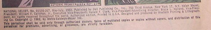 Feature continues from Four Color (Dell, 1942 series) #1195 (May-July 1961) and #1312 (Feb-Apr 1962); continues with National Velvet (Dell, 1962 series) #01-556-210 (Aug-Oct 1962).