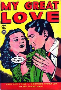 MY GREAT LOVE, April, 1950, No. 4. Published bi-monthly by Fox Feature Syndicate, Inc., 221 Conyngham Ave., Wilkes-Barre, Pa. Executive offices at 60 E. 42nd St., New York 17, N. Y. Entered as second class matter July 20, 1949 at the post office at Wilkes-Barre, Pa., under the act of March 3, 1878. Price 10c per copy. Yearly subscription in the United States and its possessions, Mexico, South America, Spain, $.75 including postage. $1.50 elsewhere. The publisher accepts no responsibility for unsolicited material. Copyright 1950 by Fox Feature Syndicate, Inc. Contents must not be reproduced without permission. The names of all characters are fictitious. Use of a name which is the same as that of any living person is accidental.