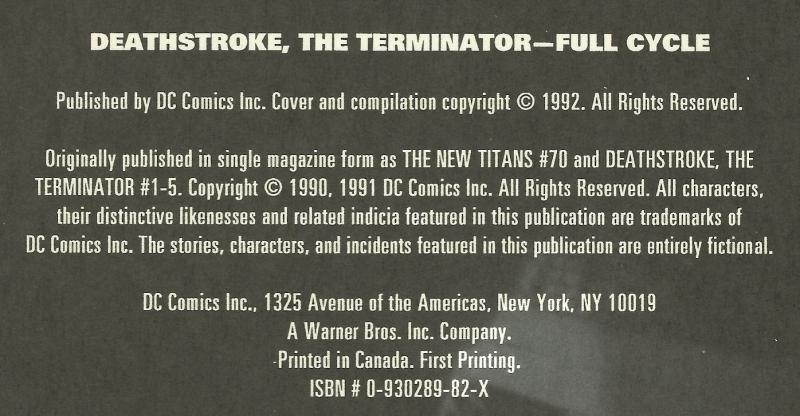 Disclose Notes: Collects The New Titans (DC, 1988 series) #70 and Deathstroke, the Terminator (DC, 1991 series) #1-5.