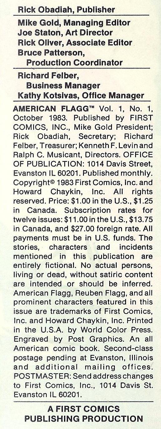Original indicia copyright information: Copyright 1983 by First Comics, Inc. and Howard Chaykin. Office of publication: 1014 Davis Street, Evanston, IL 60201.
