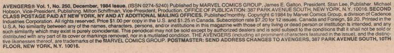 Disclose Notes: Cover title "The Mighty Avengers". On-sale date from Amazing Heroes #54, with newsstand on-sale date of 1984-09-11.