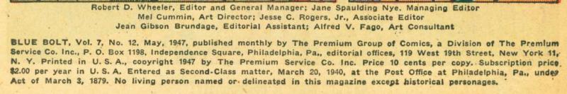 BLUE BOLT, Vol. 7, No. 12, May, 1947, published monthly by The Premium Group of Comics, a Division of The Premium Service Co. Inc., P. O. Box 1198, Independence Square, Philadelphia, Pa., editorial offices, 119 West 19th Street, New York 11, N. Y.