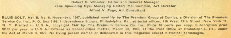 BLUE BOLT, Vol. 8, No. 6, November, 1947, published monthly by The Premium Group of Comics, a Division of The Premium Service Co. Inc., P. O. Box 1198, Independence Square, Philadelphia, Pa., editorial offices, 119 West 19th Street, New York 11, N. Y.