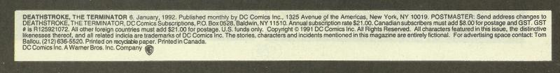 Deathstroke [Slade Wilson]; Detective Patricia Trayce (first appearance); W.R. Wintergreen; Adeline Wilson; Scoops (first appearance; one of Slade's agents), Wylie (first appearance; one of Slade's agents); Batman [Bruce Wayne]; Commissioner James Gordon; Sgt. Murdock; Sgt. Briggs; Emile Jarrett (villain, first appearance; a Gotham City mob boss); Mr. D'Angelo (villain, first appearance); Lorna Gaines (villain); Jeremy Barker (villain, first appearance); Antony Topeka (villain, deceased)