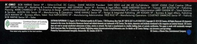 Batman [Bruce Wayne]; Batman [Bruce Wayne] (Earth-2); Superman [Clark Kent; Kal-El]; Superman [Clark Kent; Kal-L] (Earth-2); Huntress [Helena Wayne; also as Robin] (Earth-2); Power Girl [Karen Starr; also as Supergirl] (Earth-2); Wonder Woman [Diana] (Earth-2); Alfred Pennyworth (Earth-2); Jimmy Olsen (Earth-2); Jonathan Kent (Earth-2); Lois Lane (Earth-2); Martha Kent (Earth-2); Darkseid (flashback, villain); Kaiyo (villain); Parademons (villains); Steppenwolf (villain)