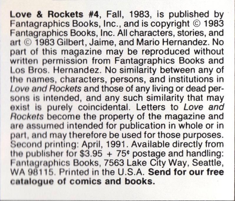 Letters of comment from David Carltock (California); Steve Leialoha and Dalison Darrow (San Francisco, CA); Matthew Levin (Brattleboro, VT); Bhob Stewart (Boston, MA); Jack Neigenfind (Danplain, PA); David Thomkins (Poughkeepsie, NY); F. Kaplan (Brooklyn, NY); Scott Hampton (Columbia, SC). A photo of the bros. on the second page.