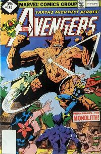The Avengers [Captain America [Steve Rogers]; Vision; Scarlet Witch; Iron Man [Tony Stark]; Wonder Man; Thor [Donald Blake]; Yellowjacket [Hank Pym]; Wasp; Beast]; Bloodhawk; Monolith; Stinger