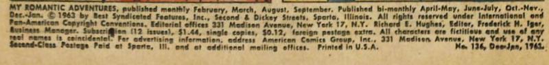 Disclose Notes: Indicia: MY ROMANTIC ADVENTURES, published monthly February, March, August, September. Published bi-monthly April-May, June-July, Oct.-Nov., Dec.-Jan. © 1963 by Best Syndicated Features, Inc., Second & Dickey Streets, Sparta, Illinois. All rights reserved under International and Pan-American Copyright Conventions. Editorial offices 331 Madison Avenue, New York 17, N.Y. Richard E. Hughes, Editor; Frederick H. Iger, Business Manager. Subscription (12 issues), $1.44; single copies $0.12; foreign postage extra. All characters are fictitious and use of any real names is coincidental. For advertising information, address American Comics Group, Inc., 331 Madison Avenue, New York 17, N.Y. Second-Class Postage Paid at Sparta, Ill. and at additional mailing offices. Printed in the U.S.A.
