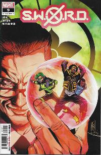 Title, credits and indicia with part of the cover inside a circle with a big X, in shades of grey. Head shots are framed in colors that match the org chart in the first issue.
