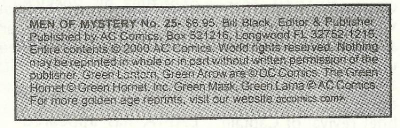 The Green Mask [Don Shelby]; Domino [Don]; Olivia; The "Devil" [Larchmont] (villain, introduction, death?); the Hatchet Men (villains, introduction, some die)