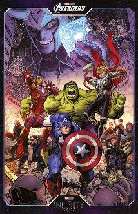 Credits and indicia with miniature illustrations from Avengers' previous hallmarks covers: Avengers (Marvel, 1963 series) #1, #100, #200, #300, and #400, Avengers (Marvel, 1998 series) #500, Avengers (Marvel, 2010 series) #33 (legacy numbered as #600), and Avengers (Marvel, 2018 series) #10 (700).