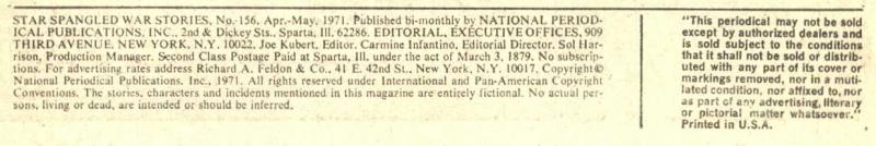 Credits for script, pencils and inks confirmed from Julius Schwartz's editorial records, provided by DC Comics. Schwartz kept editorial records for Robert Kanigher, who edited Our Army At War #154, where this story originally appeared. One panel cameo of Enemy Ace, who introduces this story, with art by Joe Kubert.