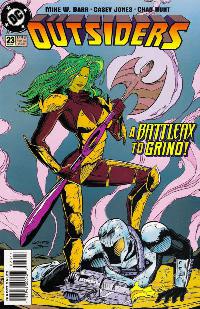 Battleax has come to retrieve the weapon that has grafted itself to Technocrat. Only its power can save her people from Eclipso. The Outsiders join her.