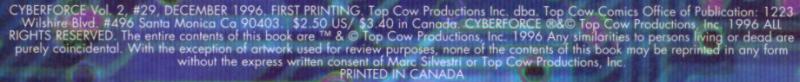 Cyberforce [Ballistic [Cassandra Lane]; Cyblade [Dominique Thibaut]; Heatwave [Dylan Cruise]; Impact [Boomer O'Shea]; Major Morgan Stryker; RipClaw [Robert Bearclaw]; Velocity [Carin Lane]; Doctor Gregory Corben; Chip]