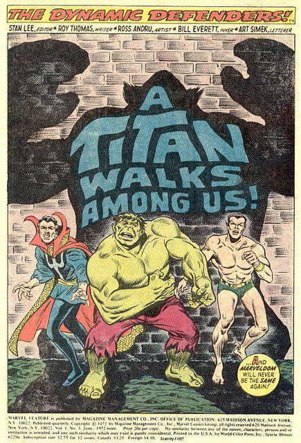 Xemnu the Titan previously appeared in Monsters on the Prowl (Marvel, 1971 series) #11 and #14, reprints of Journey Into Mystery (Marvel, 1952 series) #62 and #66. This was the first encounter between the Hulk and Xemnu. Xemnu was originally called the Hulk when he debuted two years before the Bruce Banner/Hulk.