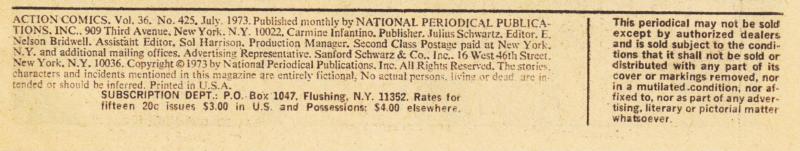 Credits for script and inks confirmed from Julius Schwartz's editorial records, provided by DC Comics. Schwartz's records credit the pencils to Giordano but the printed credits include a credit for Adams and Neal Adams' checklist (http://www.nealadams.com/comicchecklist.html) credits the pencils to Adams.