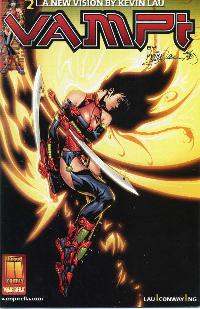 The background is comprised of several Vampi panel art screened as black and white art against dark purple pages.