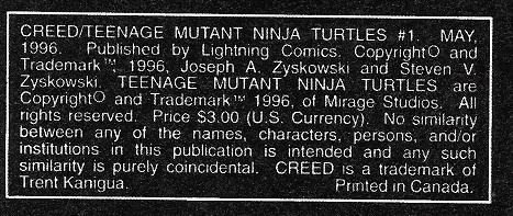 Trent Kaniuga gives thanks to his creative team, Peter Laird, Kevin Eastman, Lightning Comics, Mirage Comics and expresses delight in bringing the TMNT into the universe of Creed.