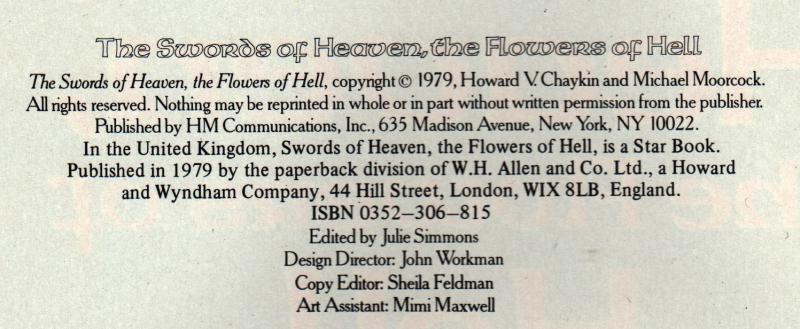 The Swords of Heaven, The Flowers of Hell was co-plotted and designed by Michael Moorcock and Howard V. Chaykin. At the time this was Moorcock's third Eternal Champion (John Daker) story--he has written several others since then.
