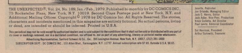 The original cover logos for Doorway to Nightmare (DC, 1978 series), The Witching Hour (DC, 1969 series), and House of Secrets (DC, 1956 series) occur on the covers of many Unexpected issues from #189 through #205.