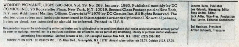 The editor mistakenly notes Bushmaster tried to kill a UN delegate in Wonder Woman (DC, 1942 series) #260; it was actually #255. Although Diana Prince was seemingly working for Doctor Fischer in Wonder Woman (DC, 1942 series) #257, in this issue, Diana still hasn't accepted the job. Diana Prince notes she previously worked for UN Security; Doctor Fischer offers her a job in disaster relief. Farley's background check on Diana Prince reveals that most of her resumé has been fabricated. Wonder Woman travels in her robot plane from New York to Washington, DC in less than 10 minutes. First mention of the Cartel, the Prime Planner's organization