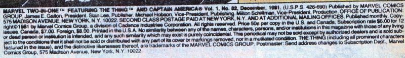Disclose Notes: Indicia title is "Marvel Two-in-One Featuring the Thing and Captain America". On-sale date from Amazing Heroes #4.