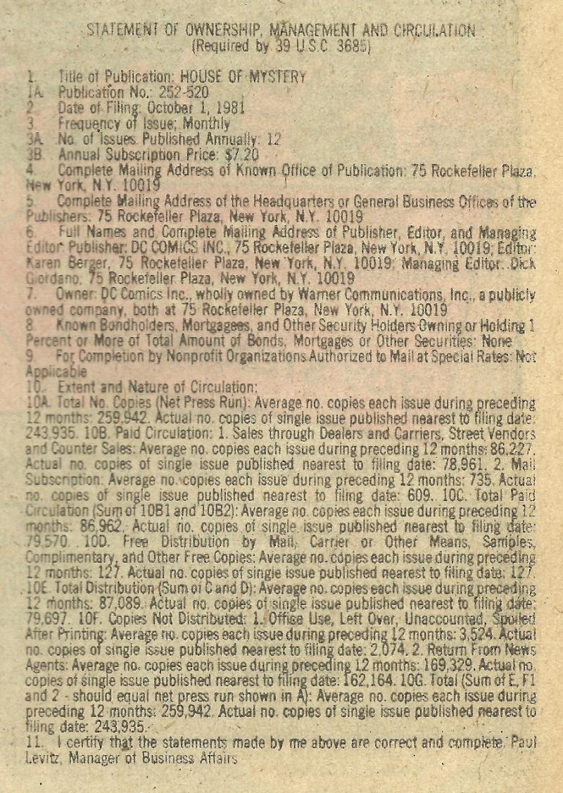 Statement of October 1, 1981, certified by Paul Levitz, Manager of Business Affairs.