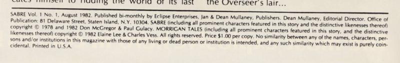Page 4 is "new" - the art from the original Sabre's (Eclipse, 1978) title page has been inserted after page 3, and the text from the original story's page 2, panel 6, the text on page 3, both in and above panel 5 as well as one new sentence have been re-lettered and applied to the former title page illustration. This edit does not appear to have been carried over to the subsequent reprints of Sabre, the 10th and 20th anniversary editions.