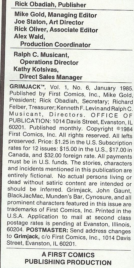 Indicia Publisher: First Comics Inc.