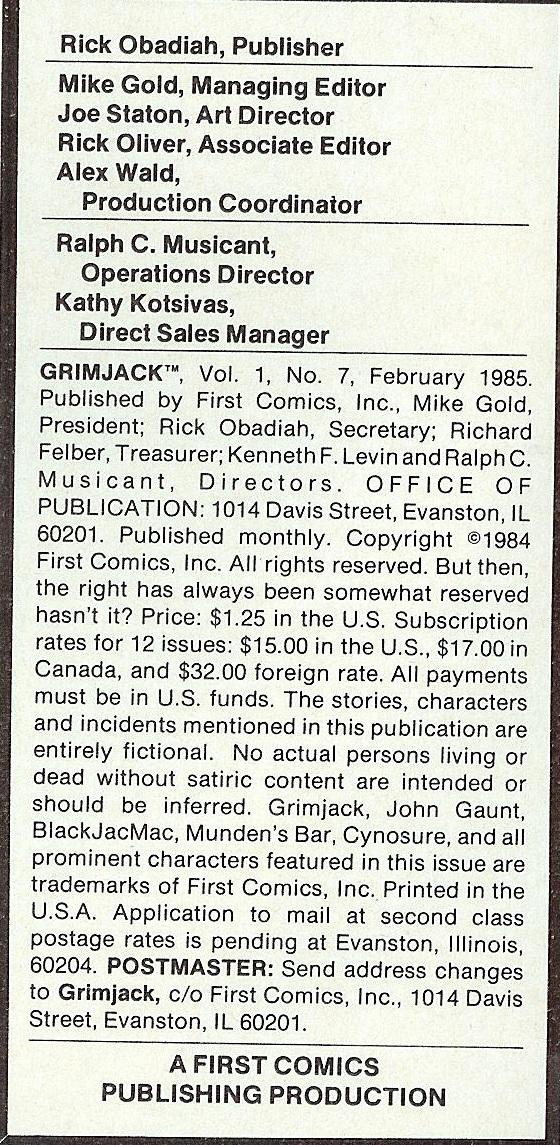 Indicia Publisher: First Comics Inc.
