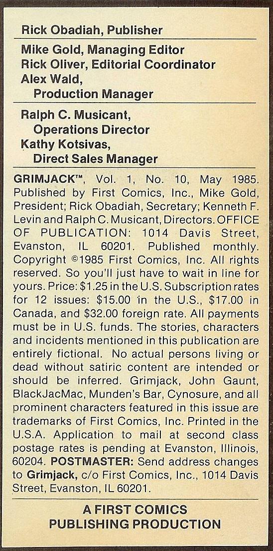 Grimjack [John Gaunt]; Jim Bell (death); Raiola (death); Roscoe Schumacher; Scofflaw; Spook; Henry "Dry" Gulch; Law-Killers [Lash; Preacher; Grunt]; Donovan; T.M.; Monte Rio